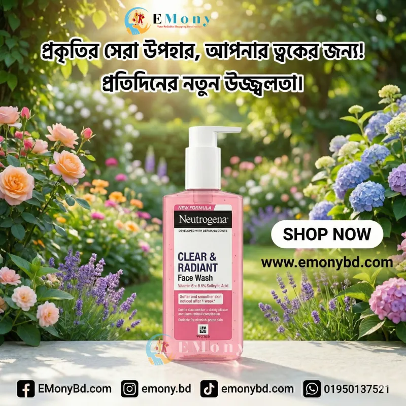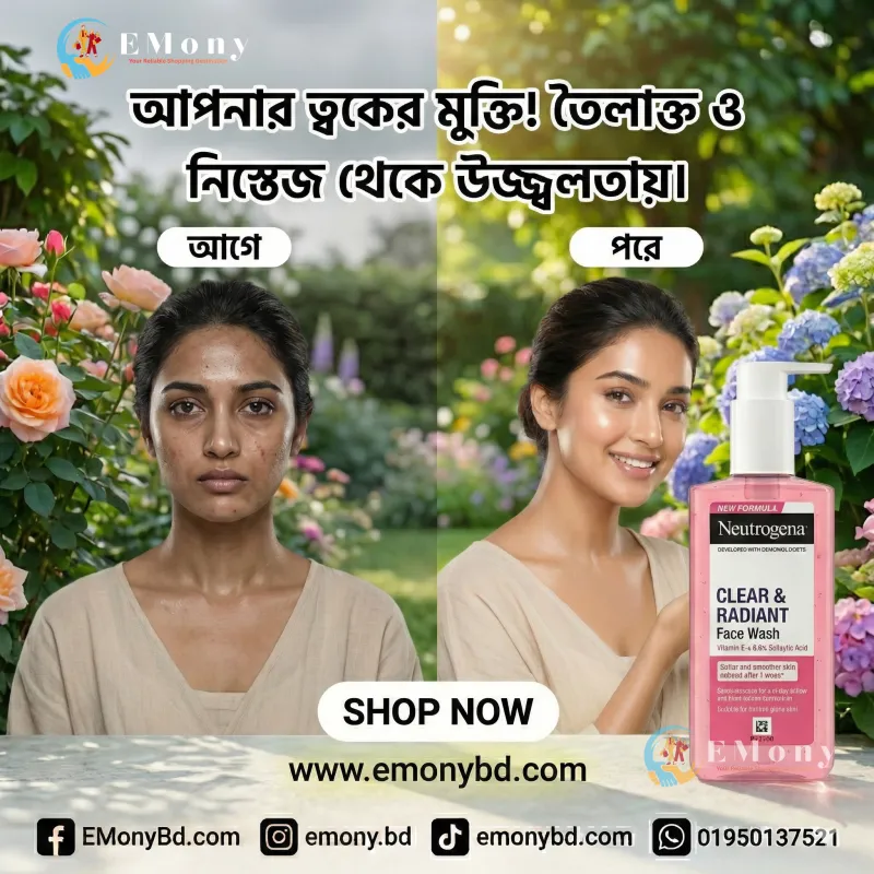 ব্রণমুক্ত এবং উজ্জ্বল ত্বকের জন্য Neutrogena Clear & Radiant Face Wash একটি অত্যন্ত কার্যকরী স্কিনকেয়ার সল্যুশন। এতে থাকা স্যালিসাইলিক অ্যাসিড (BHA) ত্বকের গভীর থেকে রোমকূপ বা পোরস পরিষ্কার করে এবং ব্রণের ব্যাকটেরিয়া ধ্বংস করে। পাশাপাশি এতে থাকা ভিটামিন সি এবং পিংক গ্রেপফ্রুট এক্সট্র্যাক্ট ত্বকের কালচে দাগ দূর করে, আনইভেন স্কিন টোন ঠিক করে এবং ত্বককে প্রাকৃতিকভাবে উজ্জ্বল ও গ্লোয়িং করে তোলে। এটি প্রতিদিন ব্যবহারে ত্বকের অতিরিক্ত তেল দূর হয় অথচ ত্বক অতিরিক্ত শুষ্ক বা রুক্ষ হয় না। যারা একই সাথে ব্রণ নিয়ন্ত্রণ এবং রেডিয়েন্ট গ্লো পেতে চান, তাদের জন্য এই ডার্মাটোলজিস্ট-টেস্টেড ফেসওয়াশটি সেরা একটি পছন্দ।