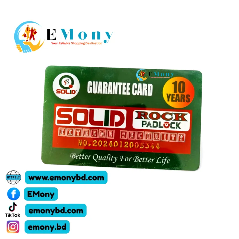 এই ৬৫ মিমি এক্সট্রিম সিকিউরিটি সলিড রক প্যাডলকটি তৈরি করা হয়েছে সর্বোচ্চ নিরাপত্তা নিশ্চিত করার জন্য। এর শক্তিশালী ধাতব বডি বুলেট প্রুফ, অ্যাসিড প্রুফ, অ্যান্টি কাট এবং অ্যান্টি ড্রিল প্রযুক্তিতে সুরক্ষিত, যা যেকোনো ধরনের বলপ্রয়োগ বা কেমিক্যাল আক্রমণ প্রতিরোধ করে।