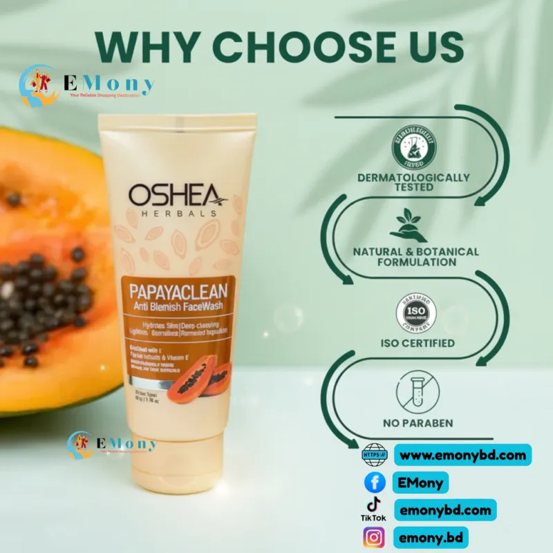ওশিয়া হার্বালস পাপায়াক্লিন ফেস ওয়াশ (১০০ মি.লি.): পেঁপে ও প্রাকৃতিক নির্যাস সমৃদ্ধ এই ফেস ওয়াশটি দাগ ও মেছতা কমাতে সাহায্য করে। ত্বককে গভীরভাবে পরিষ্কার করে, উজ্জ্বলতা বাড়ায় এবং মসৃণ করে